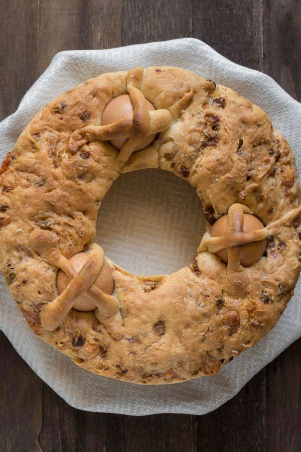 La période de Pâques vous permet de faire l’expérience de la culture italienne au travers de ses rites et traditions. A Rome, la cérémonie du Vendredi Saint au Colisée, où le Pape mène la « Via Crucis » (le chemin de croix) en mémoire de la passion de Jésus, est une procession importante qui suscite l’intérêt du monde entier. Les fidèles participent aussi à des processions dans les rues, portant bougies et statues religieuses et en chantant des hymnes. Une procession de foi qui invite au recueillement. Par ailleurs, nombreuses fêtes et événements animent les régions du Latium à cette période. Parmi eux, à Tarquinia, Palombara Sabina et Pulcherini di Minturno, sont des célébrations uniques. Autre exemple, à Tuscania, la Processione degli Incappucciati est une procession où des hommes capuchonnés liés les uns aux autres par des chaînes et marchant pieds nus suivent la statue de la Vierge Marie. À Orte, dans la province de Viterbo, la Procession du Vendredi Saint est l’un des rituels de Pâques les plus anciens d’Italie. Pendant la nuit, les membres de la Fraternité défilent en portant des croix et des symboles de la Passion. Ils sont suivis des pénitents marchant pieds nus, les chevilles enchaînées, du cercueil du Christ Mort et des Maries en deuil vêtues de noir. La procession se clôture avec la statue de Notre-Dame des Douleurs. A la fin de la procession, des fleurs sont distribuées aux fidèles. Enfin, Pâques est l’une des fêtes les plus importantes en Italie. Elle est greffée à la culture italienne telle une coquille d’escargot à son fidèle porteur ; c’est une fête de prestige. En effet, une expression italienne souligne bien l’importance attribuée à Pâques : « Essere felice come una Pasqua », ce qui, traduit en français, désigne le fait d’être heureux comme un roi. Opter pour un voyage en Italie au mois d’avril est un choix judicieux en ce sens qu’il s’agit d’une période calme, pendant laquelle vous aurez accès à une multitude de sites touristiques qu’ils soient discrets, insolites ou populaires, et ce, à l’abri de toute agitation. Vous serez donc libre d’apprécier l’Italie authentique en toute quiétude. Et puisque nous parlons de dégustation…Nous vous dévoilons la recette d’une spécialité de Campanie que vous trouverez sur toutes les tables à Pâques : Le Casatiello. Le Casatiello suscite systématiquement l’interrogation de ceux qui le découvrent pour la première fois, et ce, pour une raison : les œufs porteurs de croix. Pour la petite histoire, les boulangers de l’époque disposaient de la pâte en forme de croix sur les œufs, en rappel de la passion du Christ. Sa forme d’anneau, quant à elle, rappelle la couronne d’épines que le Christ a portée avant sa crucifixion.